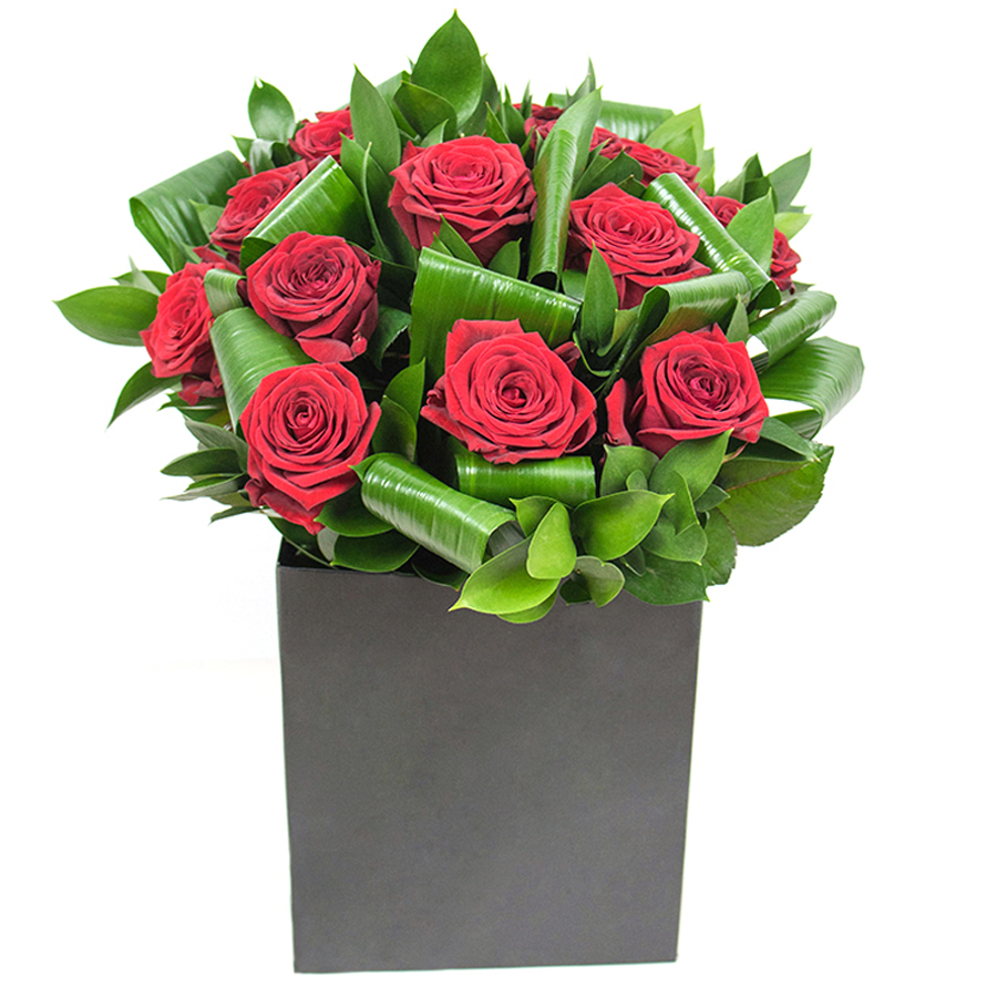 Our luxurious bouquet combines vivid red roses, graceful aspidistra leaves, and lush ruscus to create a unique and beautiful centerpiece for any home.